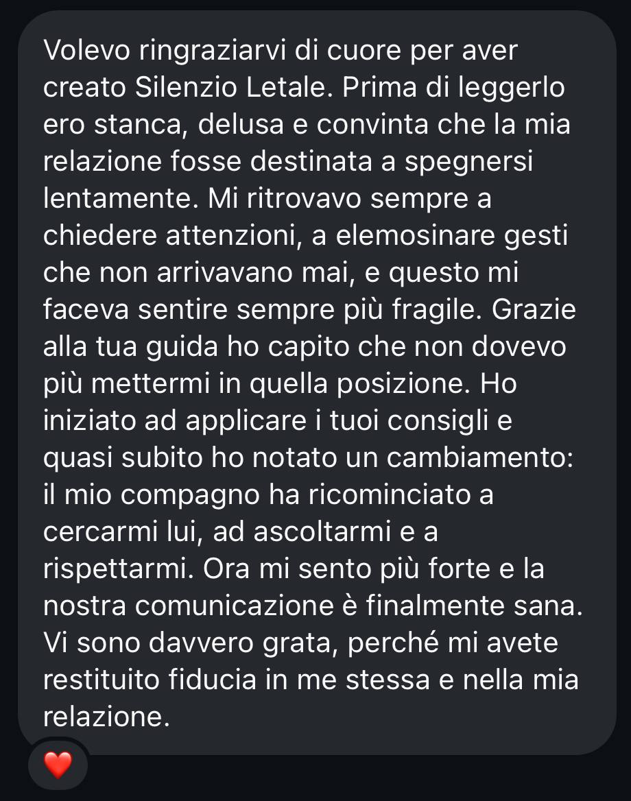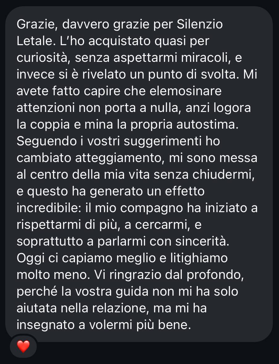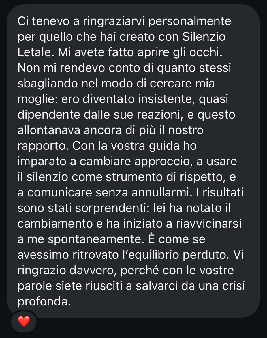 Per poter aiutare tutte le persone ad abbattere quel muro di silenzio e a stabilire un dialogo di coppia autentico, abbiamo creato Silenzio Letale il PRIMO MANUALE che offre strategie semplici e pratiche per riaprire la comunicazione di coppia riportando armonia e serenità anche quando pensi di averle provate tutte.
